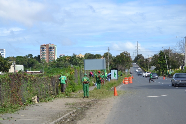 Brigadas de la Dirección General de Embellecimiento, mientras realizan labor de limpieza y eliminación de la contaminación visual, en la av. Charles de Gaulle, próximo a la Autopista de las Américas, Santo Domingo Este.