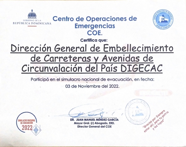 El Centro de Operaciones de Emergencias (COE) entrega certificación a la Dirección General de Embellecimiento de Carreteras y Avenidas de Circuvalación (DIGECAC) por su participación en el simulacro nacional de evacuación, dirigido por el encargado de la Unidad de Gestión de Riesgos, el Lic. Carlos Rosa. Durante este simulacro, se orientaron a los colaboradores en cómo actuar ante eventos catastróficos.