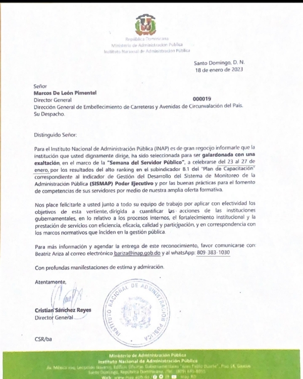 El Director General de la DIGECAC, Lic. Marcos De León, recibió una exaltación en la Semana del Servidor Público, por los resultados del alto ranking en el subindicador 8.1 del Plan de Capacitación correspondiente al indicador de Gestión del Desarrollo del Sistema de Monitoreo de la Administración Publica (SISMAP) y por las buenas prácticas para el fomento de competencias de sus servidores.